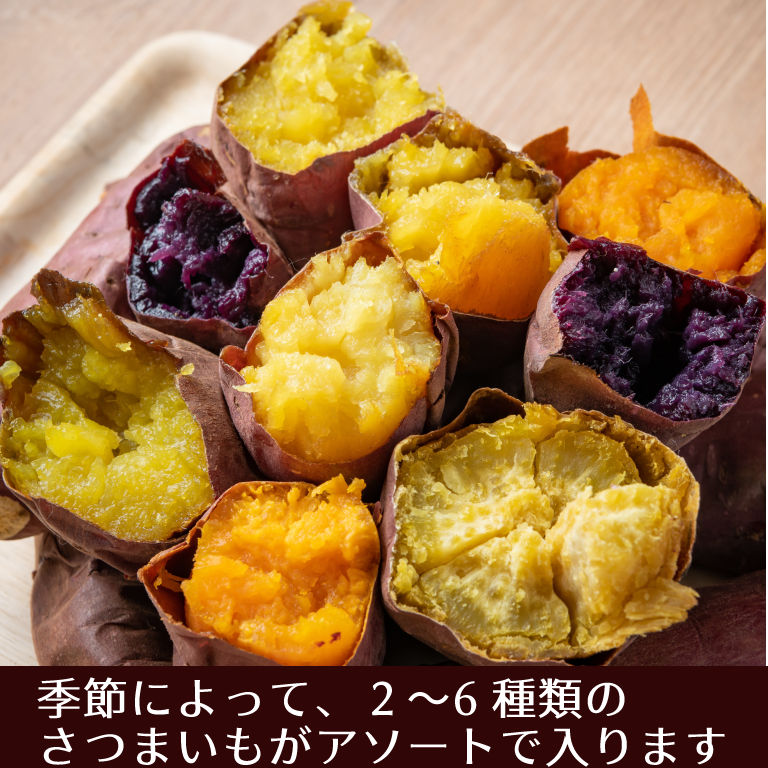 焼きたてのおいしさをそのままパック。一年中、いつでも甘くておいしい焼き芋をお出ししております。佐之衛門では、シルクシート、紅はるか、あいこまち、ハロウィンスイート、すずほっくり、ふくむらさきの6つのお芋を育てています。その中から取り混ぜて2種類を選んだ、絶品詰め合わせ、食べ比べのセットです。